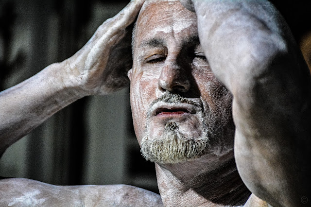 Favorisant tantôt le visage, tantôt le torse, tantôt les jambes et le tout au gré de ses mouvements que je scrutais à la loupe, j'ai attendu ces petits instants furtifs où la vie se dessine d'elle-même sur le corps de l'artiste que j'avais en face de moi. J'ai suivi du regard toute son évolution, dans les moindres changements de messages et dans les mouvements les plus imperceptibles. Très attentive à toute sa performance j'ai reçu en plein objectif chacune de ses émotions.